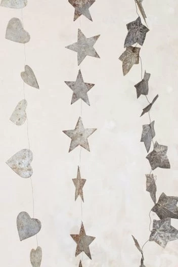 Nkuku Abari Wire Garland Heart, Star or Leaf Rustic zinc finish Handmade Can be moulded into shape Approx. 190cm long Product Code: 26983 Add some bohemian charm to your home with the Nkuku Abari Wire Garland. In a heart, star or leaf design, these handmade metal garlands offer a mesmerising rustic zinc finish that gives them a worn and distressed finish, and thanks to the thin metal can be shaped and moulded to give them a three-dimensional finish. Joined by a wire that can be twisted into shape, they look amazing as part of a table display, or hung above the mantelpiece in your living room.