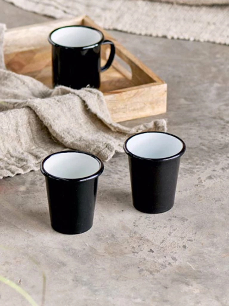 Striking and simple, the Abessa enamel cup from Nkuku has a glossy, hardwearing black finish. Sturdy and resilient, these vessels are practically unbreakable. The longevity of enamelware means that pieces survive for decades, being passed down generations. It is great for use in the kitchen as cookware or for outdoor use in the garden or camping trips. The enamelware is made in India by a father and son business. Enamel (H) 10 x (Dia) 9 cm 1kg Capacity 250ml Food safe Dishwasher safe Oven safe up to 250 degrees Fahrenheit Do not use in a microwave