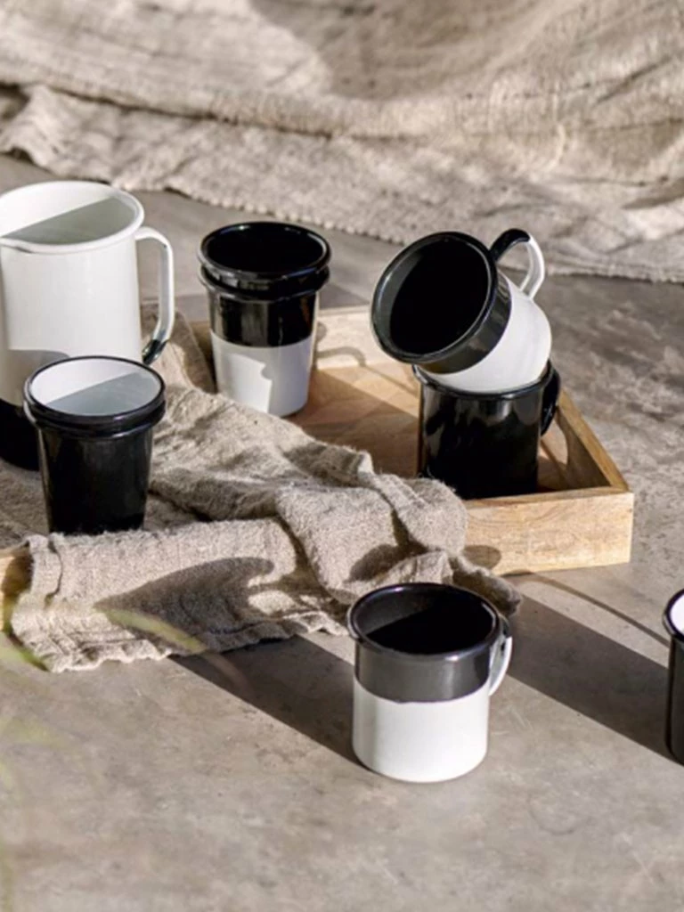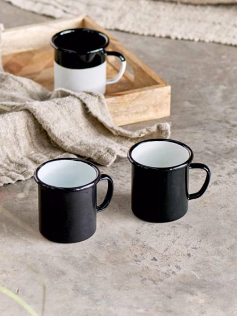 Striking and simple, the Abessa enamel mug from Nkuku has a glossy, hardwearing black finish. Sturdy and resilient, these vessels are practically unbreakable. The longevity of enamelware means that pieces survive for decades, being passed down generations. It is great for use in the kitchen as cookware or for outdoor use in the garden or camping trips. here are sometimes marks on handles from where the hanging pins are used during the making process. The enamelware is made in India by a father and son business. Enamel (H) 9 x (Dia) 9 cm 0.75kg Capacity 350ml Food safe Dishwasher safe Oven safe up to 250 degrees Fahrenheit Do not use in a microwave