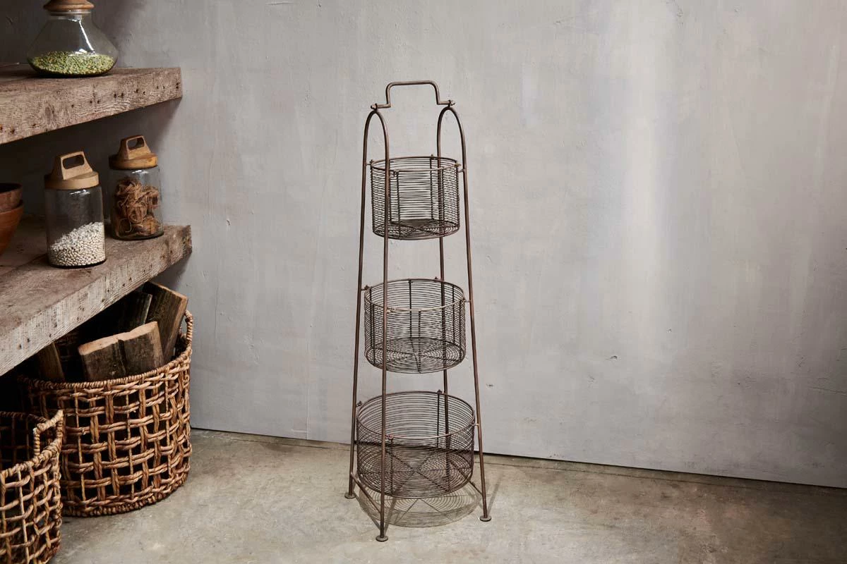 The warm tones of our aged brass Inkollu Three-Tiered Storage Stand is a stylish standalone piece, perfect for storing fruit & vegetables and other food items. Style in a kitchen or larder.