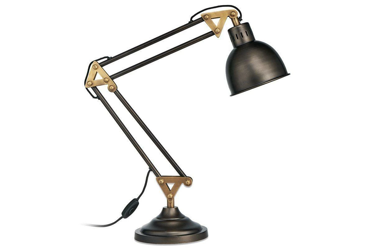 Our akono desk lamp has a sophisticated aged bronze finish, this gives a modern antique look. It makes an ideal desk accessory and quirky bedside light. The lamp has an adjustable head and the cable is black fabric.