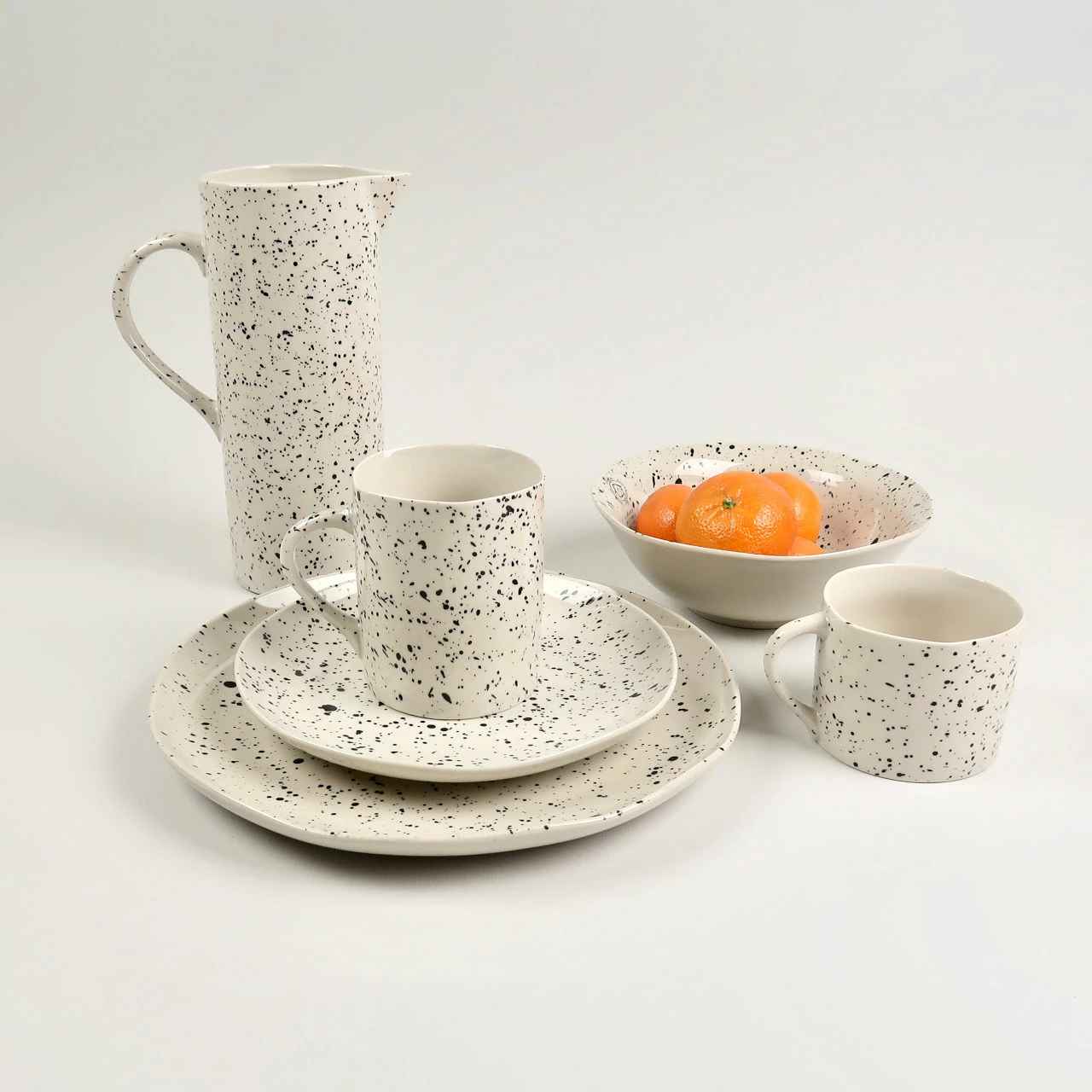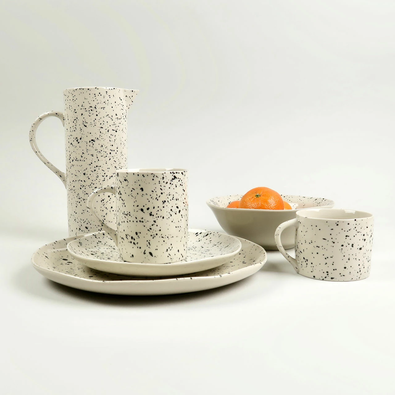 This range of ceramics by Nkuku is called Ama and all features a random splatter pattern on a creamy glazed background. The range incorporates plates, bowls, jugs and these mugs.