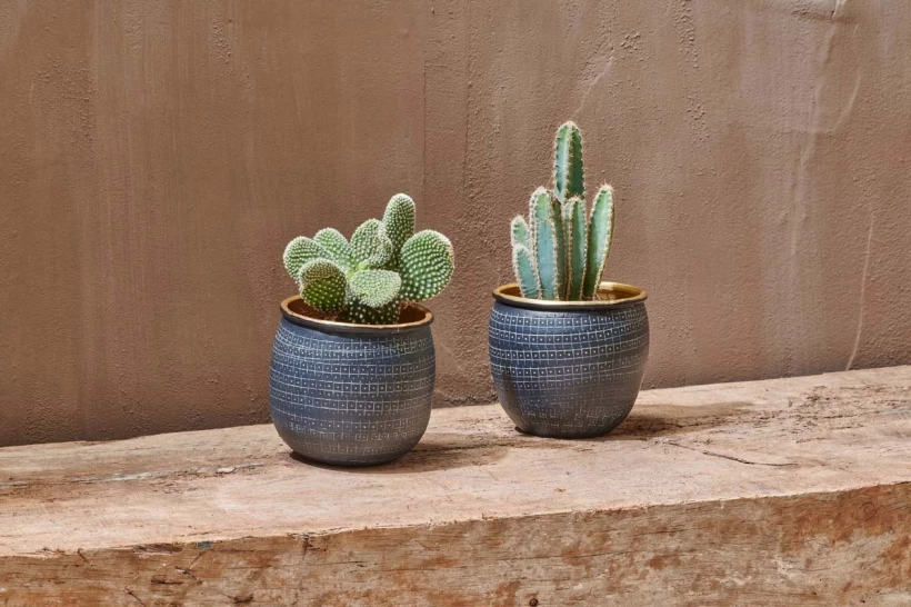 Planting has never looked so striking with the Tembesi collection of planters. Handcrafted from aluminium and finished in a warm brass hue, the collection is ideal for house plants, cacti and succulents. The etched pattern is crafted by hand onto the aluminium base. The planters have an eye – catching black exterior and antique brass interior.
