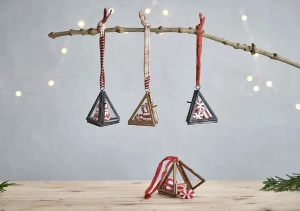 These enchanting Tiny Kiko pyramid decorations are waiting to be fiilled with gifts for the tree. The black has a rustic hue which pairs beautifully with the glass windows. Not limited to the tree, these exquisite boxes make a unique and luxurious gift packaging idea for jewellery and other small ornaments. Choose from brass and antique black finishes. Each box is soldered using age-old metal working skills. The front of each box opens neatly with a pin catch. The tie is made from recycled sari. Please note this listing is for the antique black decoration only, each piece is sold separately.