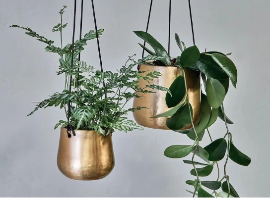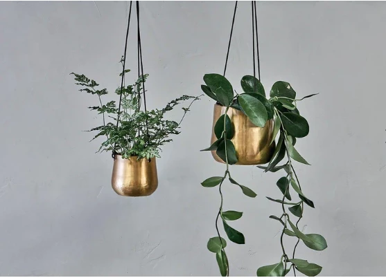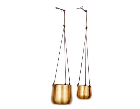 Colour: Brass Material: Antique Brass Size: 9cm x 11 cm Dia Weight: 188g Capacity: 500ml Tie Length: 40cm – opening width is 8cm The golden hues of brass of our Atsu planters really extenuate the smooth contours of this elegant hanging pot. The brass is a striking back drop against green foliage making an eye -catching combination. Each planter is hung with leather ties.