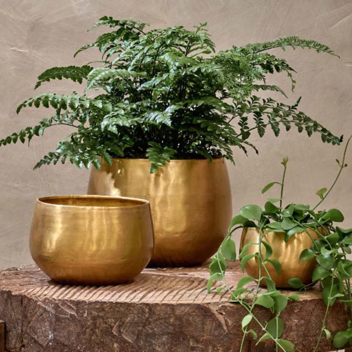 This stylish Atsu brass planter has a smooth finish and curved shape, with the golden brass hues adding to its sophisticated look. To create a eye-catching display style in trios with a mix of sizes and varieties of house plant.
