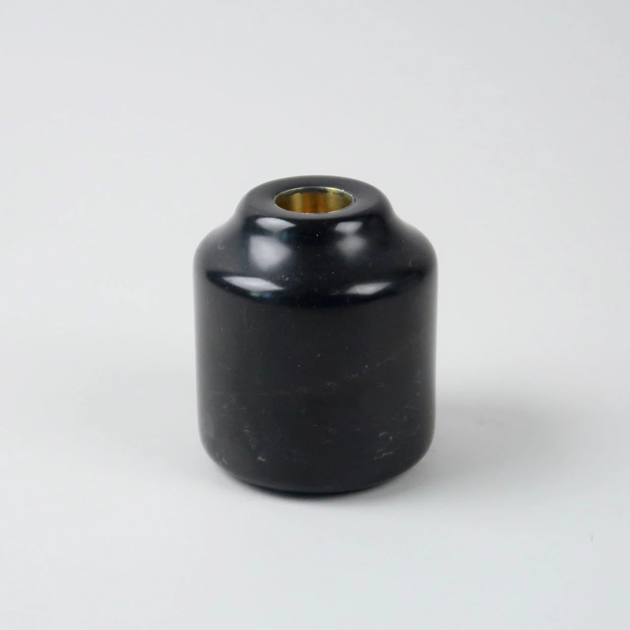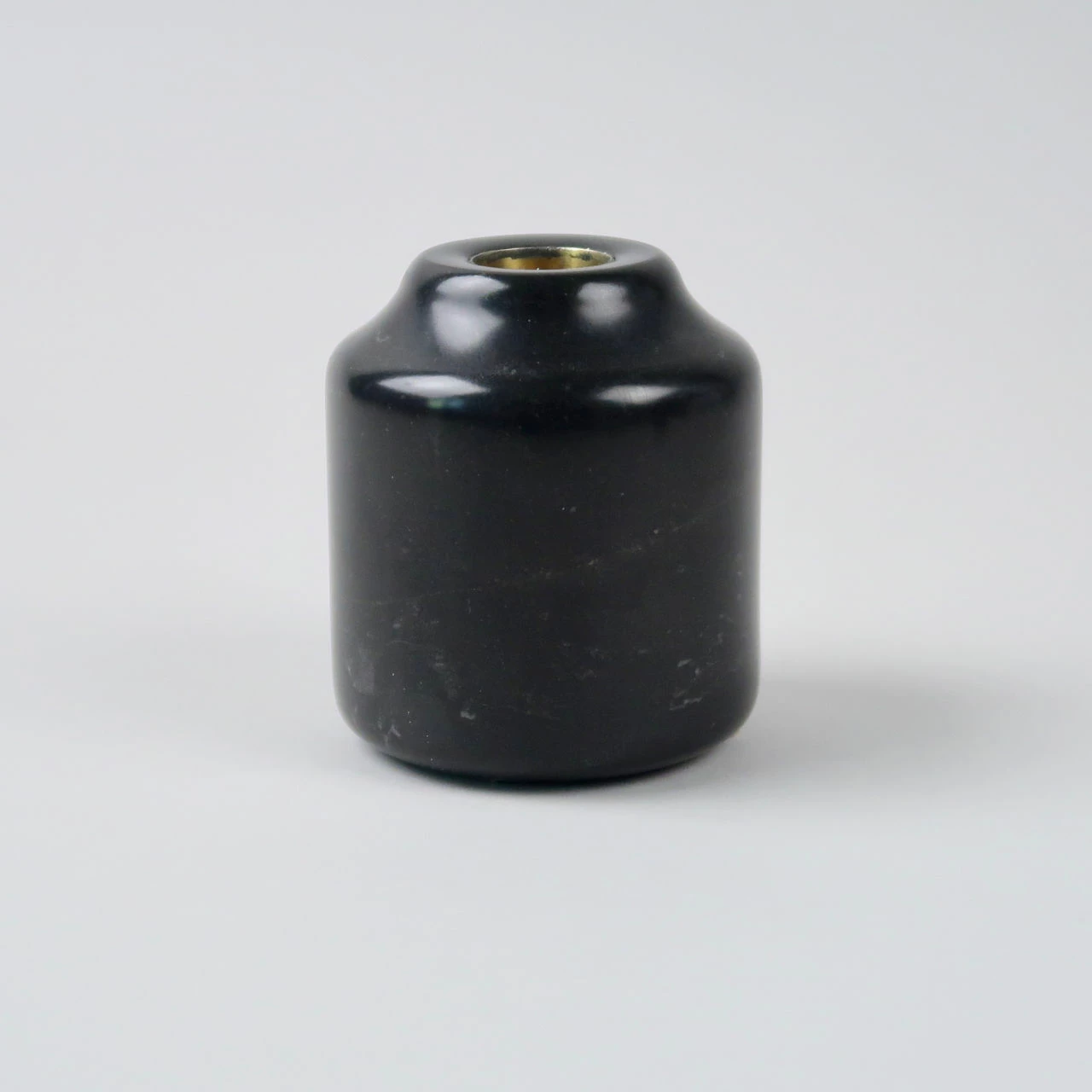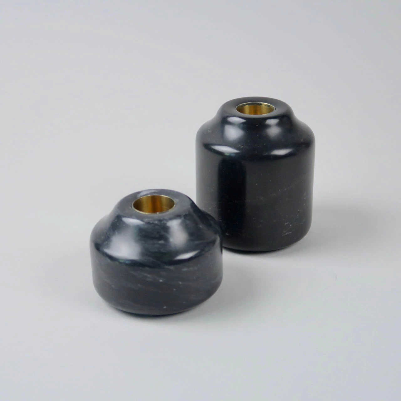 These marble candlesticks come in two different size options: this large version and then a smaller variant. They are made from a marble that is largely a greyish black but has striations of a lighter grey running through it. The aperture for the candle is lined in brass.