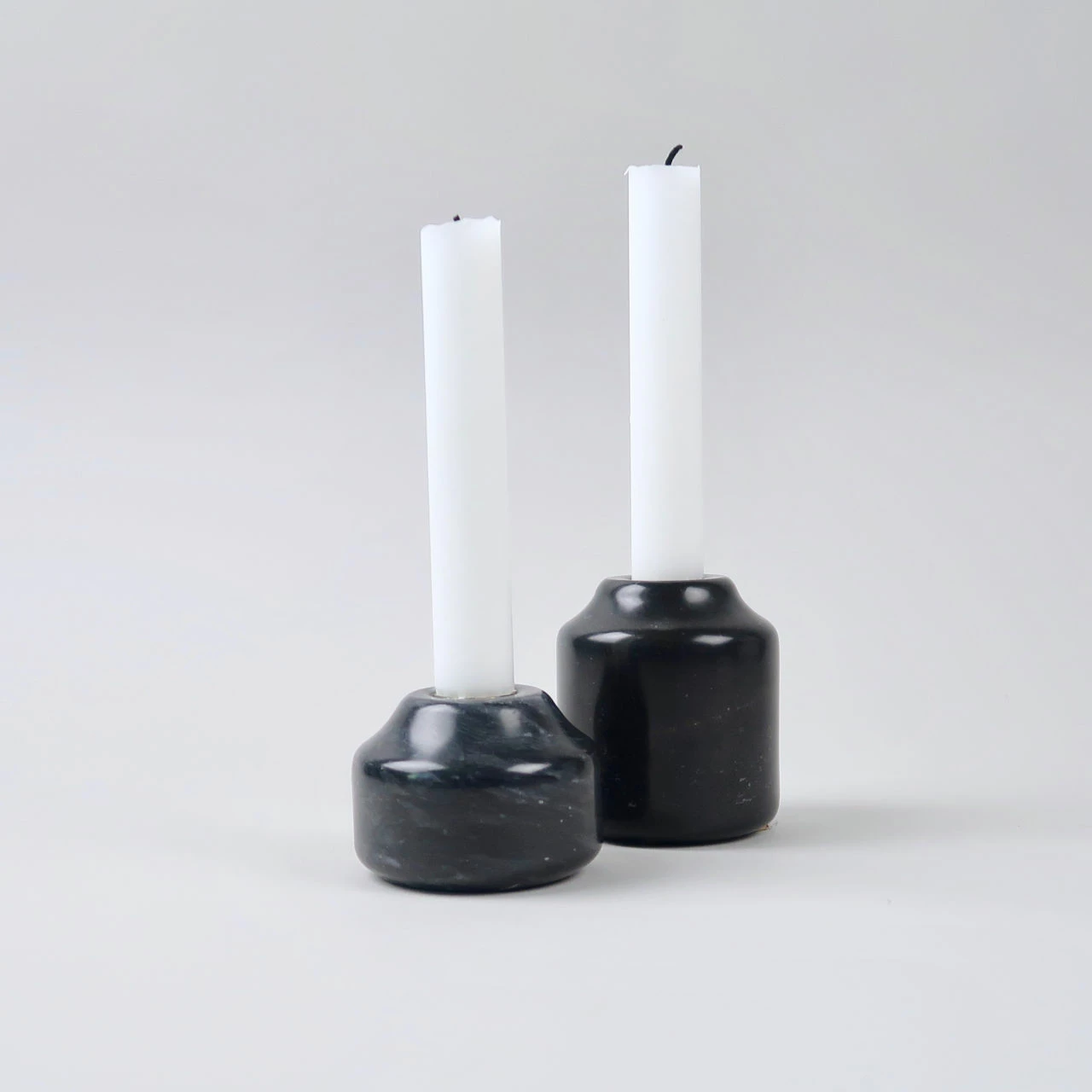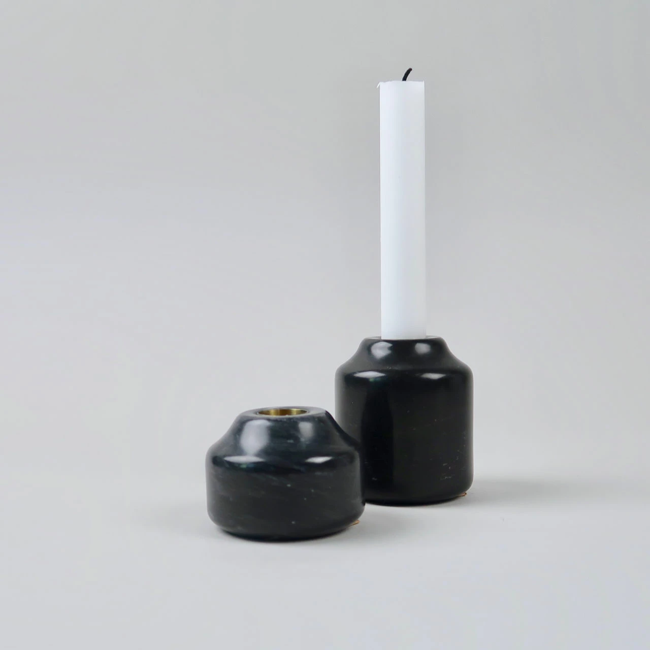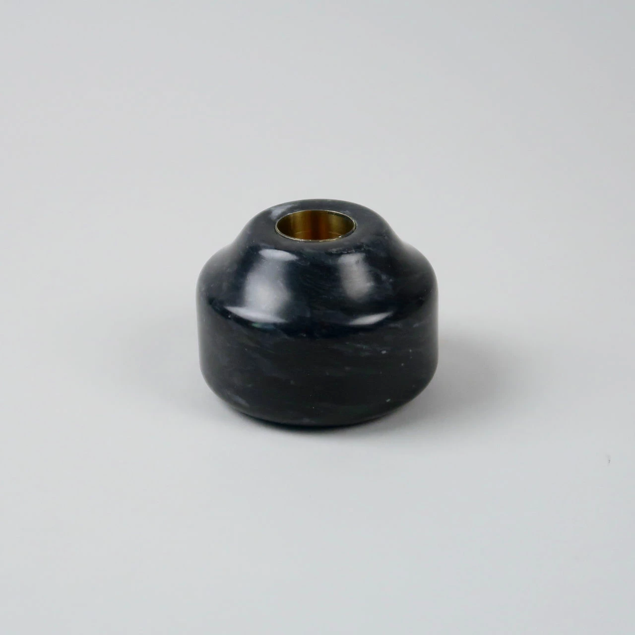 These marble candlesticks come in two different size options: this small version and then a larger variant. They are made from a marble that is largely a greyish black but has striations of a lighter grey running through it. The aperture for the candle is lined in brass.