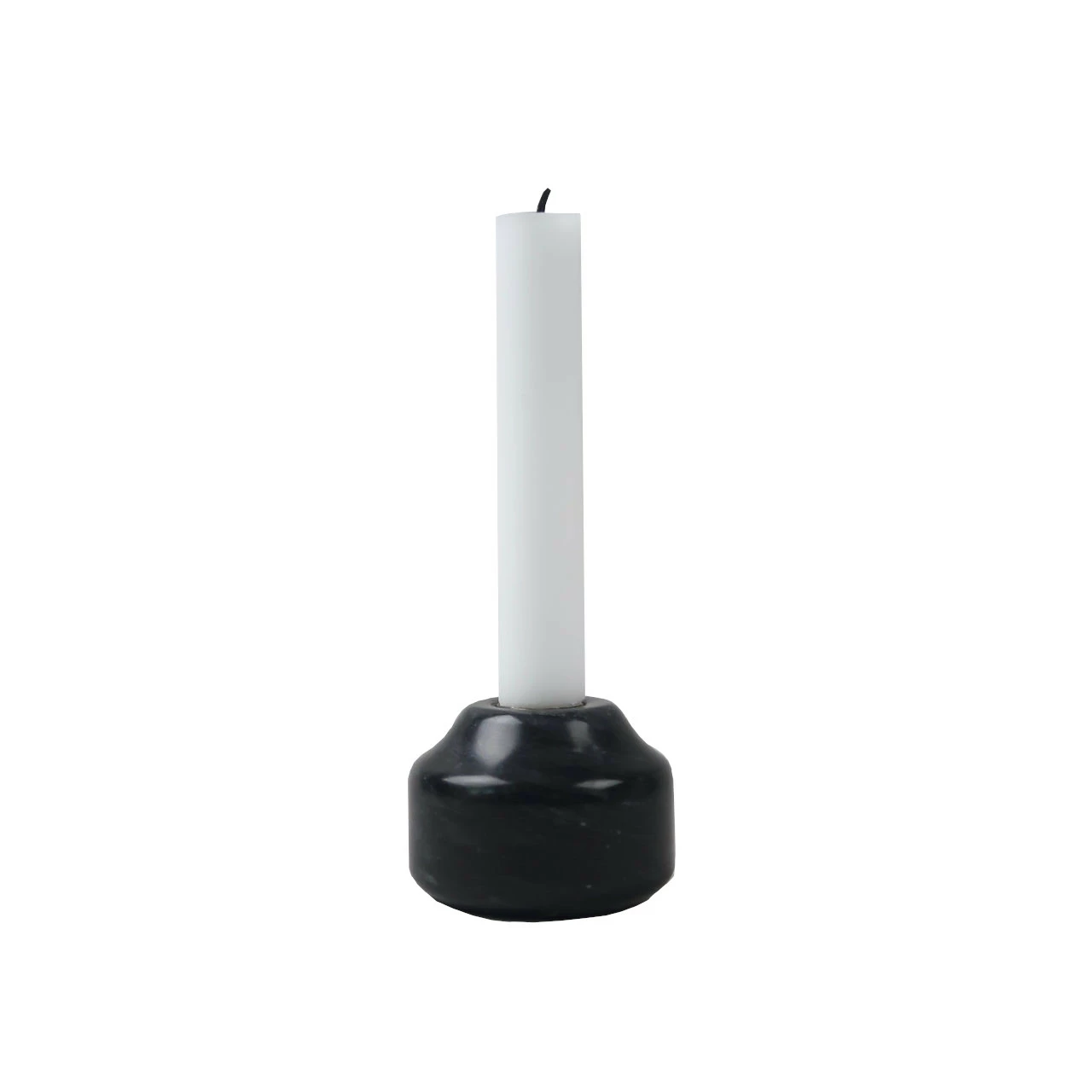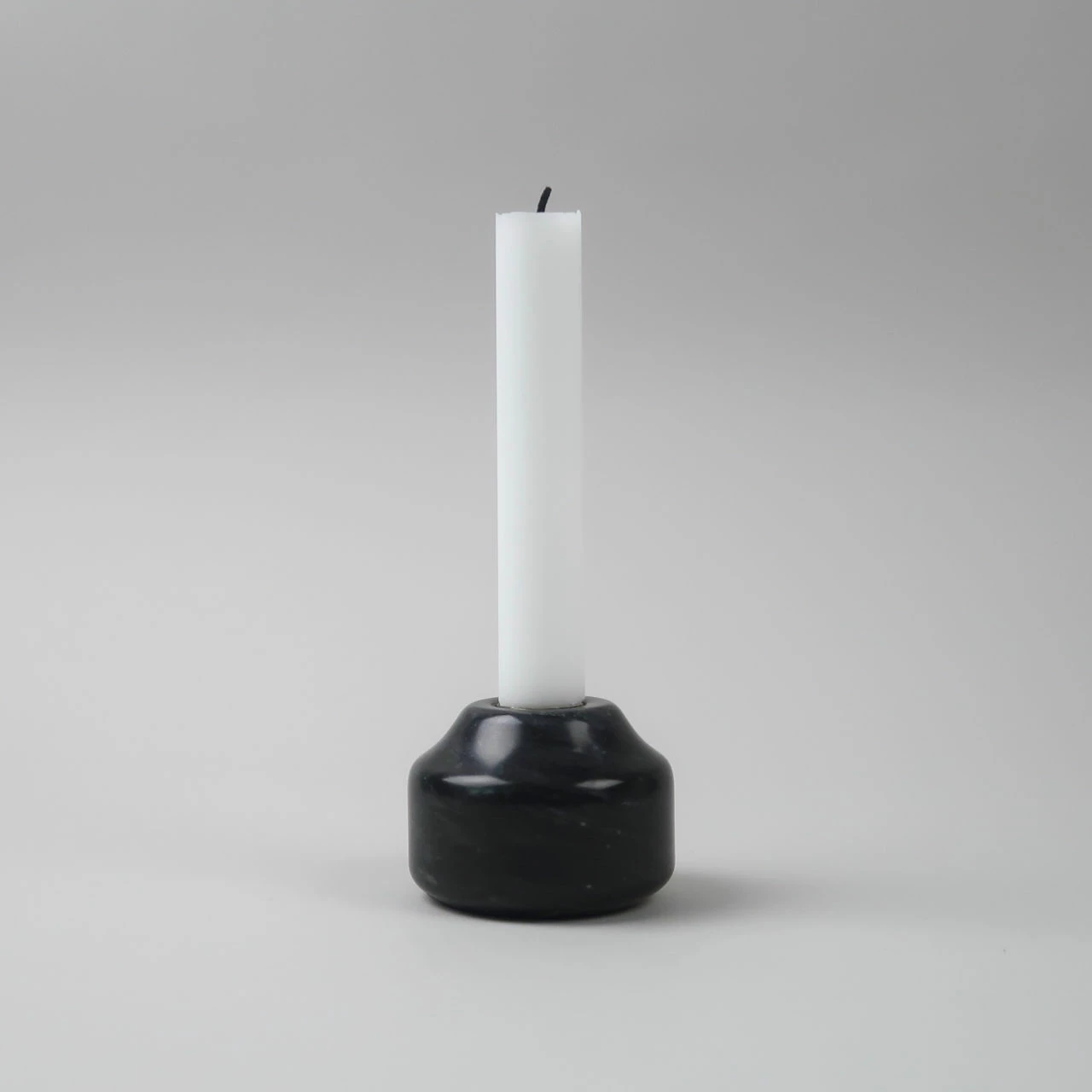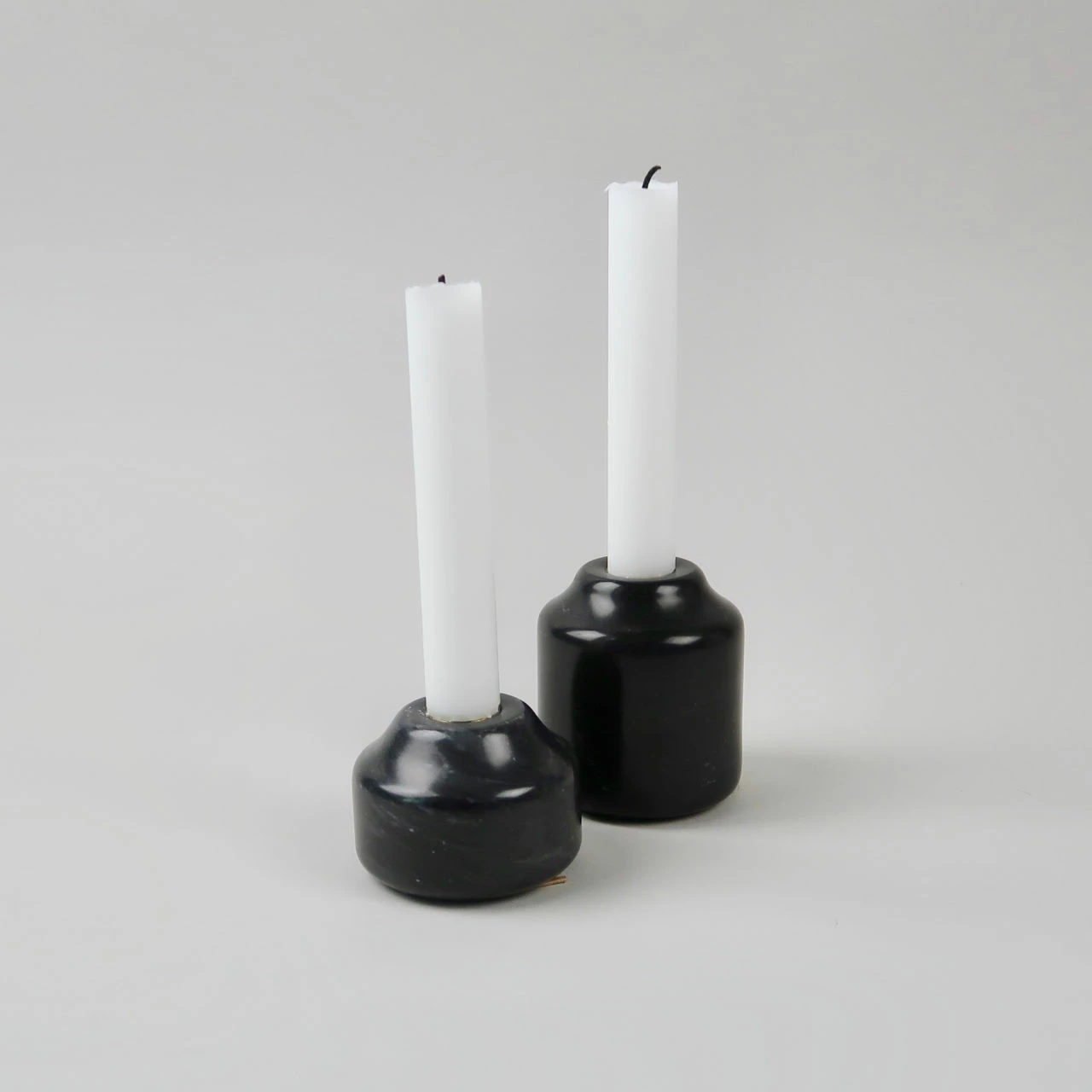 These marble candlesticks come in two different size options: this small version and then a larger variant. They are made from a marble that is largely a greyish black but has striations of a lighter grey running through it. The aperture for the candle is lined in brass.