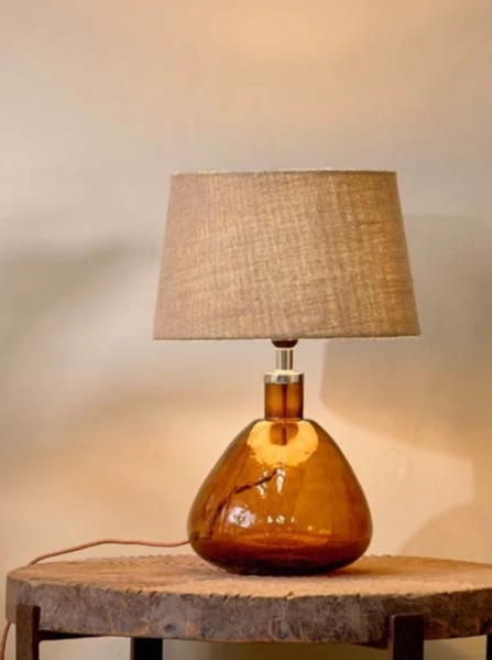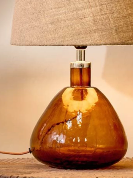 This small glass Baba table lamp is perfectly imperfect with an organic shape of the recycled glass base and a sophisticated burnt amber colour hue. The glass is skilfully hand blown using tradtional methods in a mould to create this unique and timeless shape. The small size makes this perfect as a bedside light or side table lighting. The table lamp has black fittings and a black fabric cable. Our Baba Burnt Amber Glass Lamp – Small Wide is suitable for use with a Small Lampshade 14.5cm x 15.5/20cm (dia).
