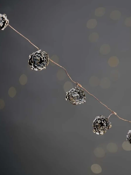The understated elegance of the Baranti bud garland marries aged zinc complete with its rustic qualities with an endearing natural bud design. Each bud has been carefully crafted by hand and strung along a wire garland allowing you to shape and mould the garland along a mantelpiece or window sill. This timeless decoration has a paired back charm that brings the tones of a natural woodland into your home. Dimensions: 170cm x 2.5cm x 2cm