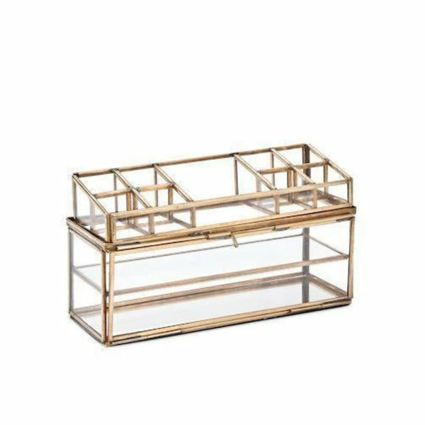 The Bequai open jewellery box is made up of stylish compartments that fit neatly together in an elegant box. The well-designed segments are suited to holding all types of jewellery. The metal is skilfully soldered around the glass with traditional tools; this handmade process means that there are weld marks on the joins of each piece, a feature that we love as it tells the story of how the product is made. Antique gold finish Made from Brass H 13cm x W 23cm x D 8cm Made in India Nkuku was founded on the back of a life-changing adventure for Ali and Alex Cooke when they set off on a year-long round the world trip. From the outset they were inspired and humbled by the talented craftspeople and their beautiful work they saw. It then encouraged them to do something different, so on their return, they moved to rural Devon and started working with artisans throughout the world, supporting and celebrating their skills by bringing their products to a wider audience.