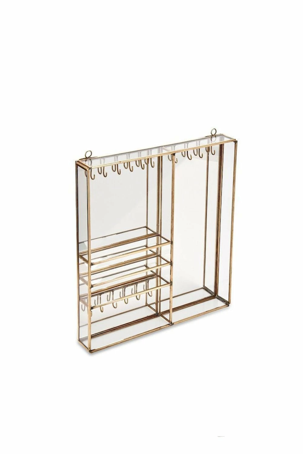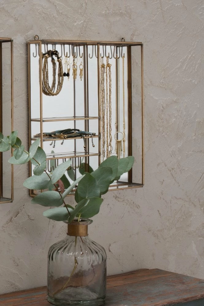 30.5 x 28 x 4.5cm Display your jewellery in style with Nkuku’s Bequai Wall Hung Jewellery Box. This handmade wall-mounted jewellery display comes in an antique brass finish with glass backing to add a reflective element. With several hooks and compartments for necklaces, bracelets and earrings, the box also has shelves to beautifully display your rings. You’ll never have a knotted necklace again! Bequai Wall-mounted Glass and antique brass Hooks and shelves Product Code: 35225