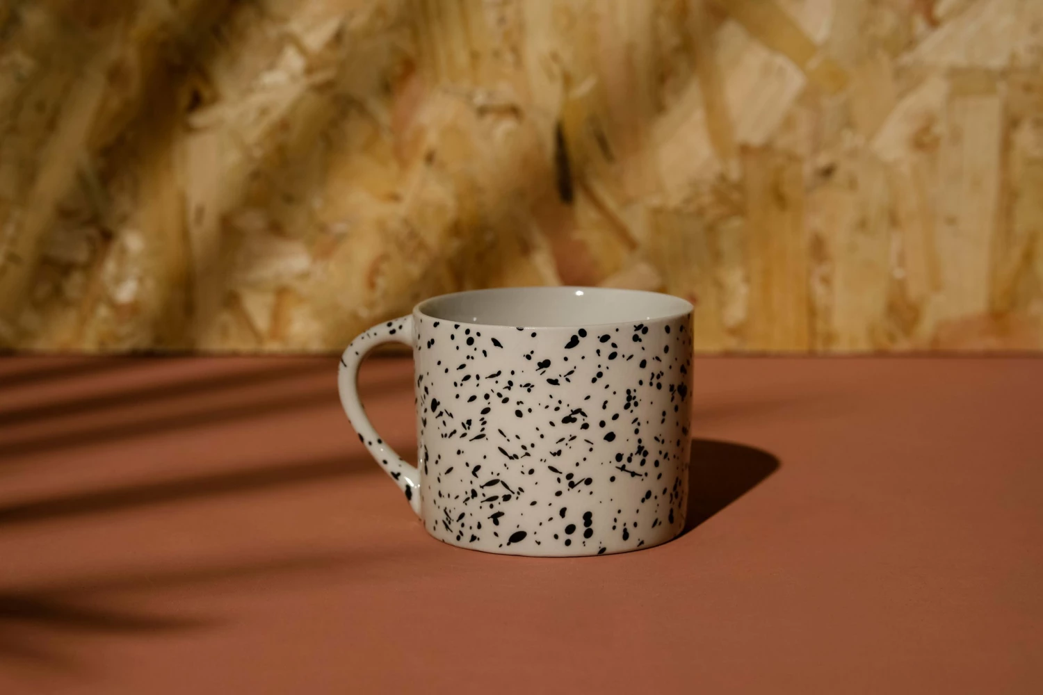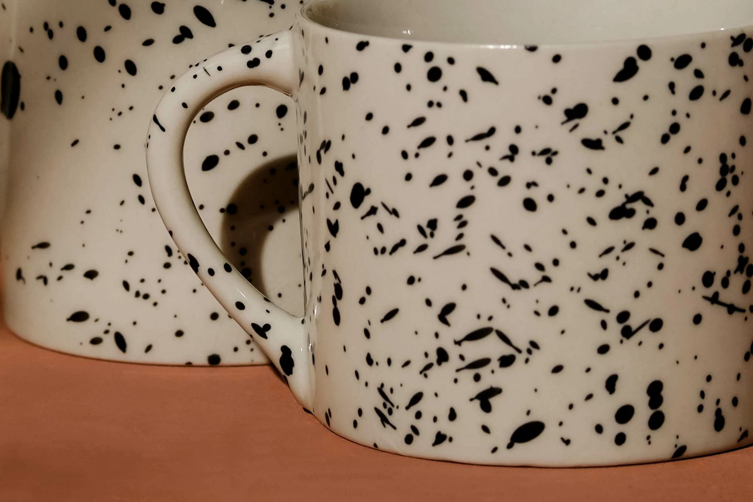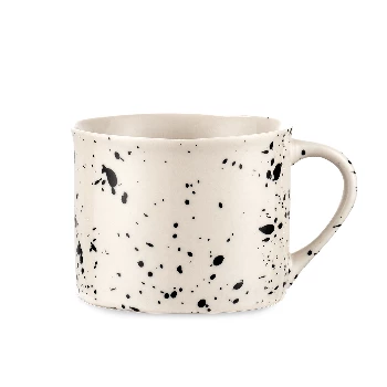 A handmade white ceramic mug from Nkuku, decorated with a black splatter pattern. These artisan made Ama short coffee mugs are decorated with a black splatter affect. This eye-catching design is created by hand. These stylish mugs have a smooth glaze finish and tactile quality. These ceramics are handmade in Vietnam by skilled artisans, using a wealth of techniques some that are thousands of years old. The collections are painted and shaped by hand incorporating indigenous and contemporary influences.