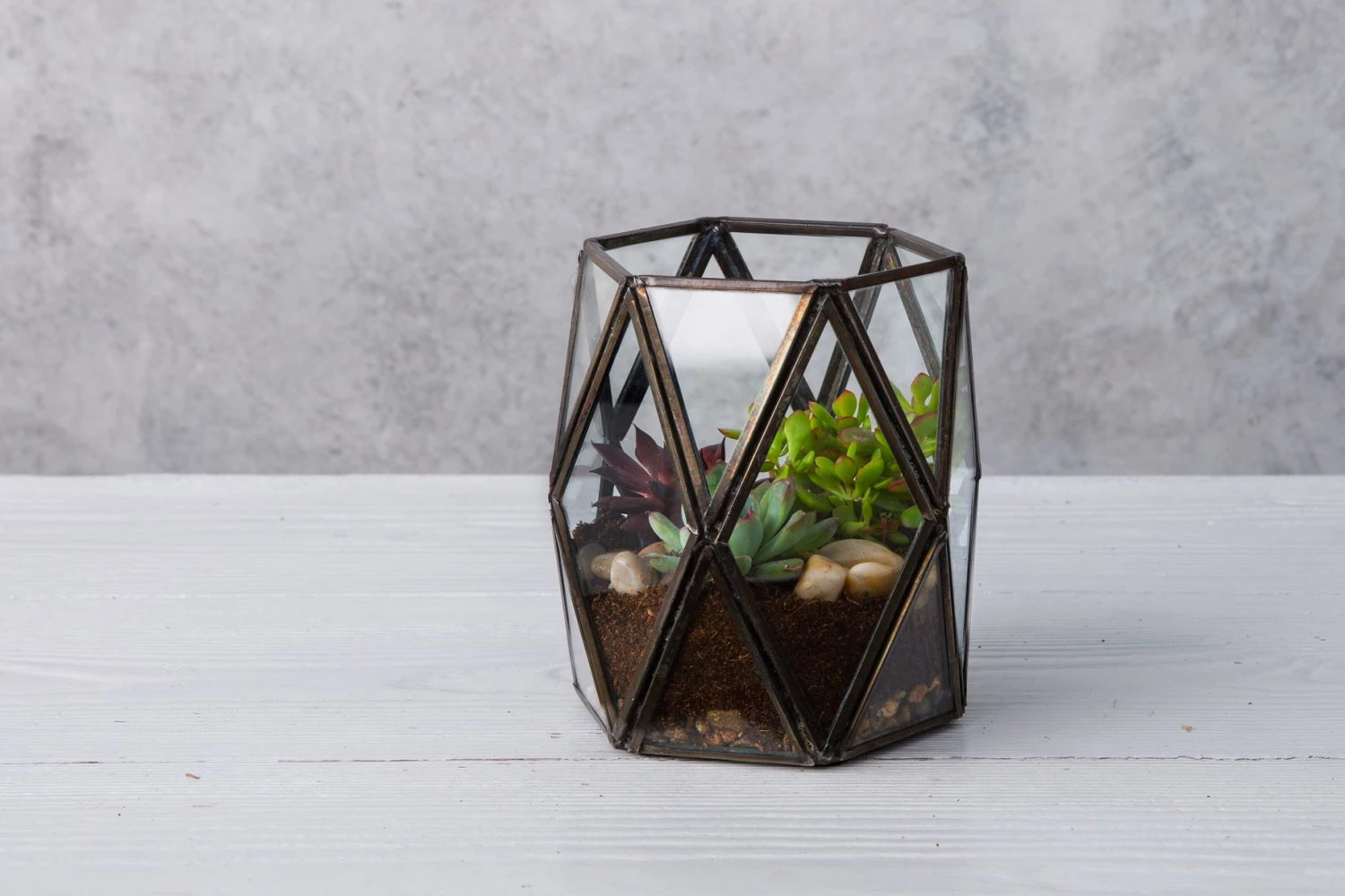 A hand crafted black metal and glass terrarium, ideal for housing mini cacti and succulents. Plants in image sold separately.
