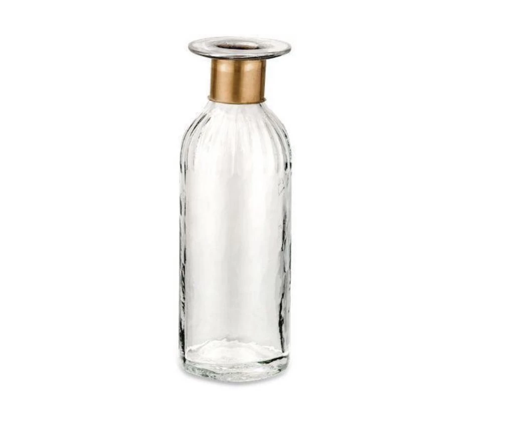 These elegant Chara bottles are decorated with a hammered glass finish and etched detail. The bottle is skilfully created by blowing glass through the brass ring in this stylish design.