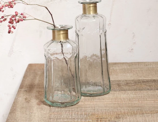Chara bottles are full of sophisticated rustic charm; these artisan made pieces involve hammering the glass with traditional tools providing a subtle textured affect. The glass is skilfully blown through the brass ring creating this elegant shape. Solder marks are often evident on the brass as a result of this complex handmade process.