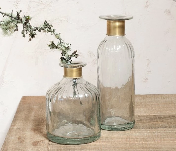 These elegant Chara bottles are decorated with a hammered glass finish and etched detail. The bottle is skilfully created by blowing glass through the brass ring. This does mean there are sometimes solder marks on the brass.