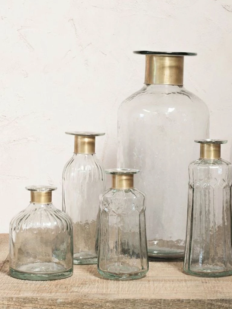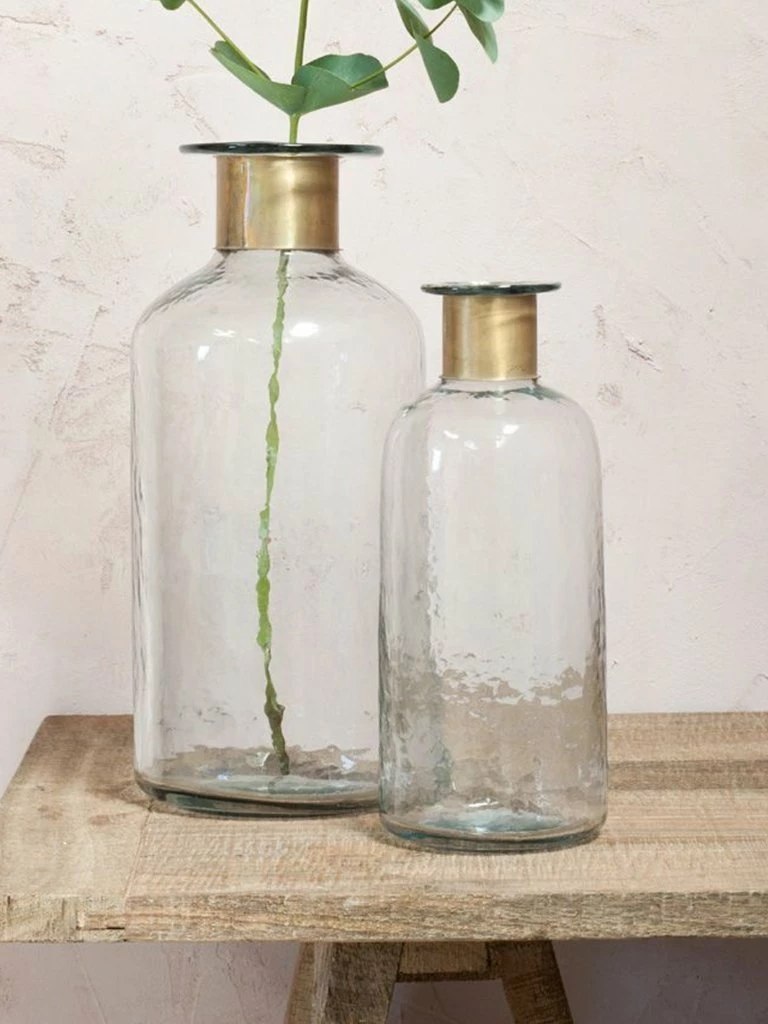 These elegant, rustic Chara bottles from Nkuku are decorated with a hammered glass finish and etched detail. Each bottle is skilfully created by blowing glass through the brass ring. Solder marks are often evident on the brass as a result of this complex handmade process. All bottles are made from recycled glass. Recycled glass and brass 39cm (h) x 17cm (dia) 3.1kg 7000ml capacity