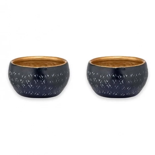 The Darani black and antique brass tealights have an appealing, curved bowl shape. The textured pattern around their circumference showcases the charm of the handmade process and traditional tools that have been used to create it. The black exterior feels sophisticated whilst the antique brass inside enhances the glow of a tea light within. The Darani tealights display well in multiples, adding pretty dapples of light to a table.