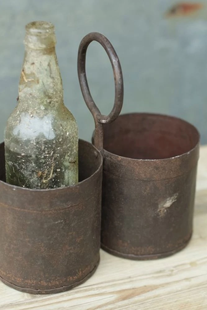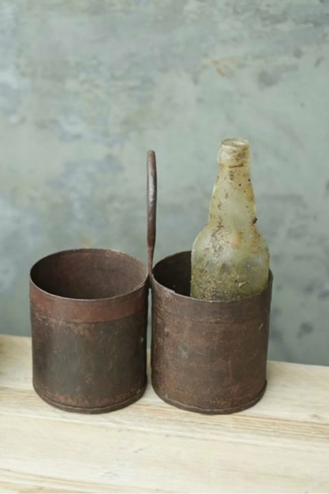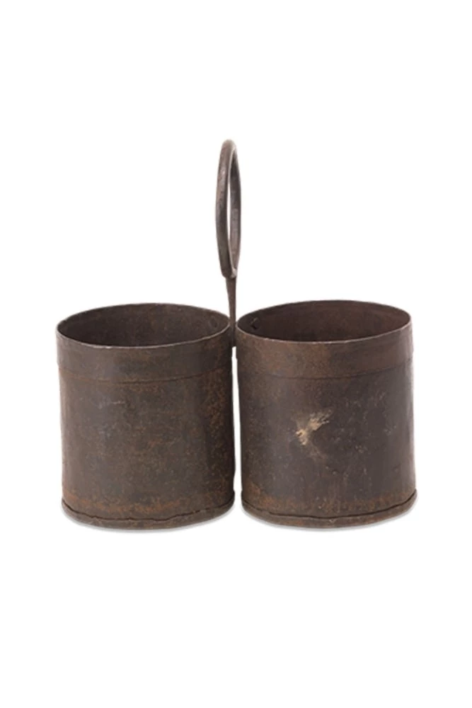 Nkuku Dendi Storage pot Double pot Handmade Reclaimed metal sheet Iron ring handle Perfect size for a wine bottle Small 24 x 22 x 11cm Product Code: 28620 The perfect addition to your dining room table, the Nkuku Dendi storage pots add a casual lean to dinnertimes. In a double pot design, they have been handmade from reclaimed metal sheets, with an iron ring for easy carrying. In a rustic finish, they are the ideal for keeping cutlery in the middle of the table, as well as being the perfect size for a wine bottle – or two! Not only for eating and drinking, they can also be used as pen pots for a tidy desk.