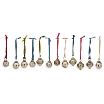 A gorgeous set of 12 antique gold glass baubles that reflect the light beautifully. These are handmade by artisans using recycled glass for Nkuku and each is finished with a rustic metal hoop and recycled sari fabric tie. They are the perfect addition to a Christmas Tree.