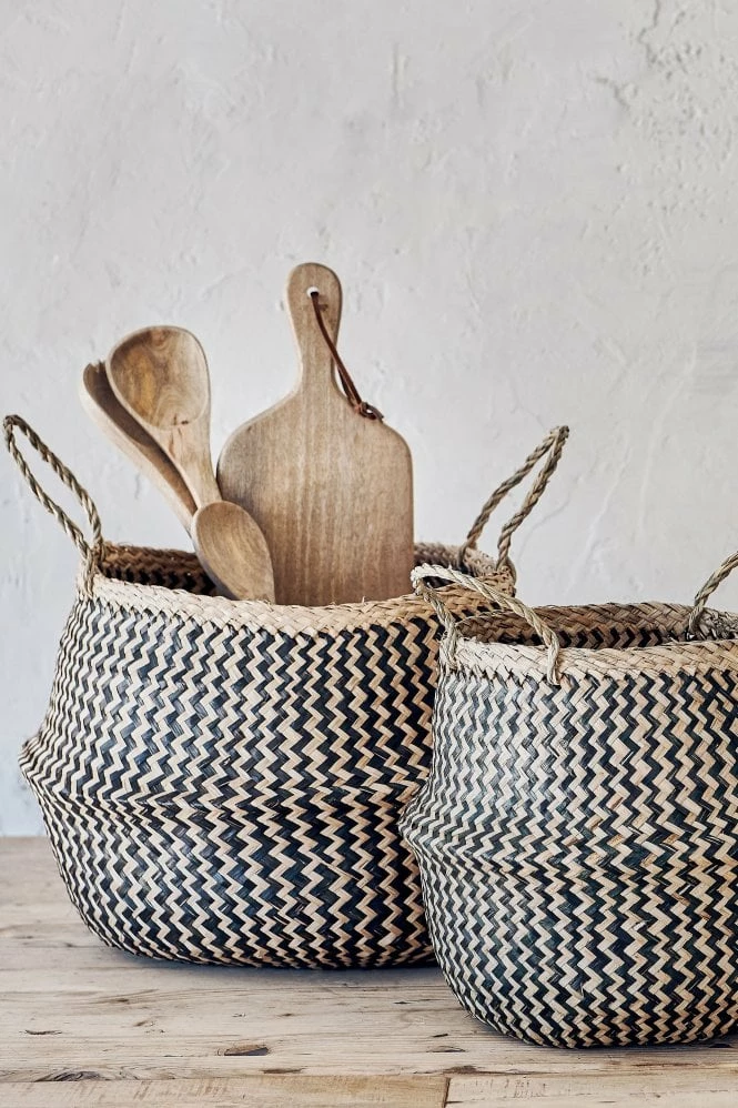 Small – 38 x 30cm Medium – 40 x 35cm Large – 40 x 40cm Please note that the height measurement includes the handles which are approx 10cm Inspired by travels through Vietnam and Cambodia the Ekuri Baskets in Black and Natural by Nkuku are a super stylish storage solution with the striking zig zag weave. Crafted by hand these traditional handmade sea grass baskets are a great idea as a holder for plants or tidying away clothing or household pieces. Seagrass Basket Handmade Ekuri Black and Natural 36321