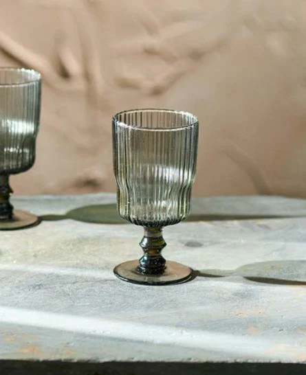 Fali Wine Glass- Smoke Glass Ribbed finish 15 x 7.5 x 7.5cm Here we have the Fali Tumbler in Smoke from Nkuku. These perfectly proportioned goblet style wine glasses have a smoke coloured hue and attractive ribbed design.