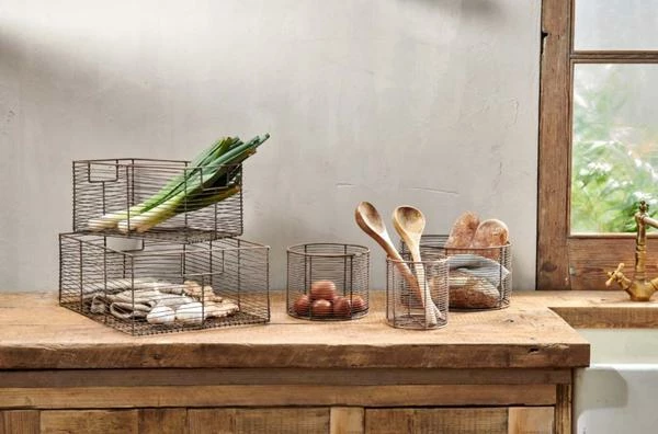 Utilitarian in design, the Inkollu collection of practical storage includes a stylish basket. The stylish aged brass wirework is well-suited to a kitchen environment and provides the perfect storage solutions to keep your worktop clear and cupboards orderly. IB4901 17cm x 21cm x 34cm.
