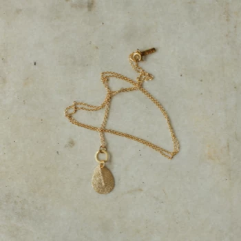 This beautiful Isa necklace from Nkuku has been handmade by artisans in India. All Nkuku jewellery is handmade for them by a fair trade enterprise. It is made from brass plated in 22 karat gold. The stylish necklace is made up of a leaf shaped decoration with an eye -catching hammered finish that creates a textured surface to the decoration. A simple but stylish design. Drop 41 x 1.5cm
