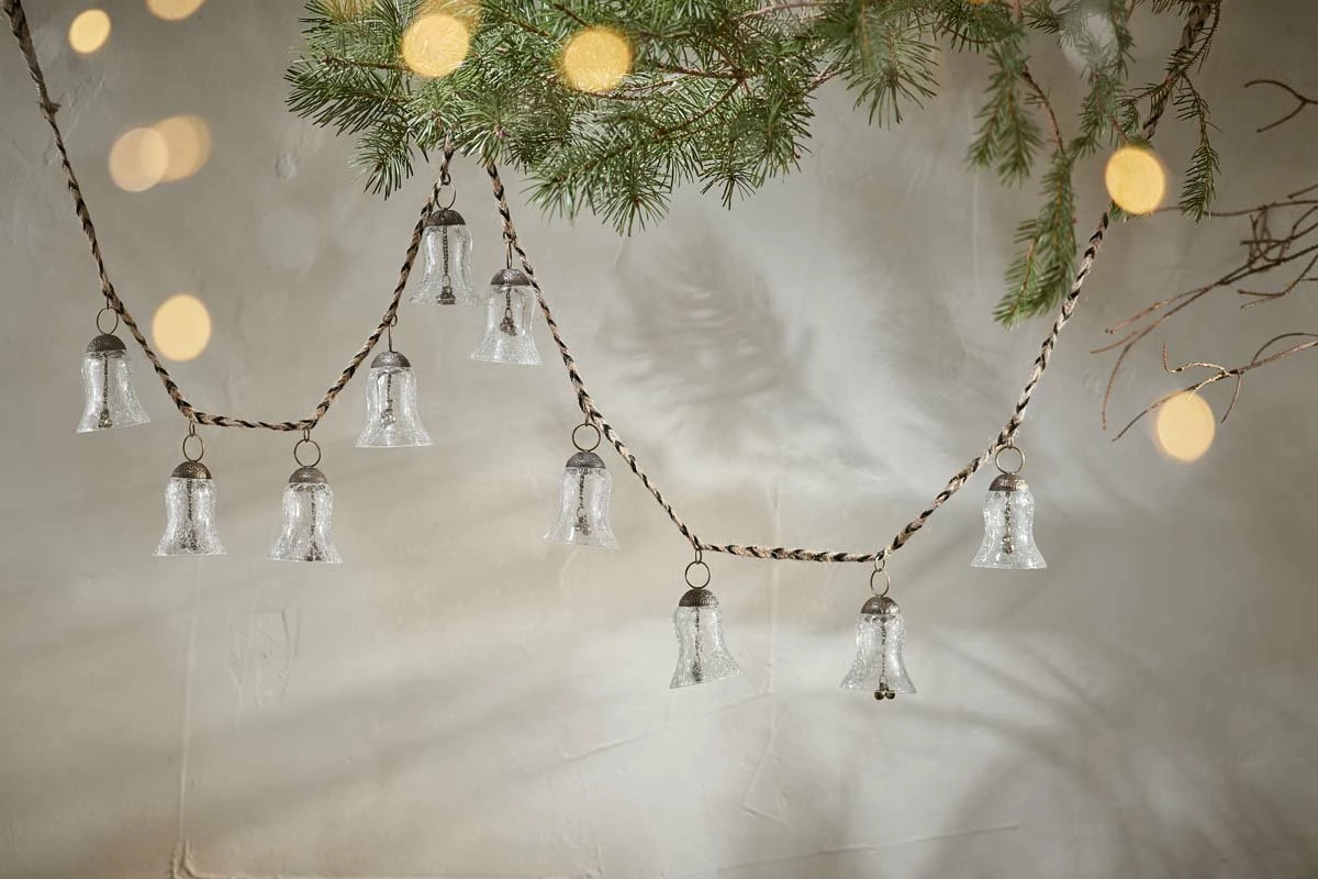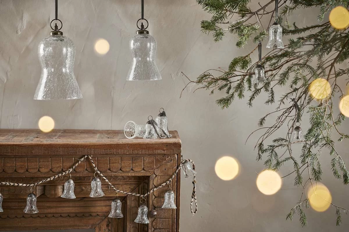 This striking Garland is strung with stunning crackle glass Gari bell shaped baubles. The crackled glass, also known as ice glass, is created by dipping the glass when its molten into ice cold water. The affect is a stunning crackle finish that appears to sparkle in the light. String the garland across a fireplace or around a tree and create an elegant festive display.