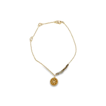This lovely Jaki bracelet from Nkuku is handmade by artisans in India. Using age old techniques artisans use their skills to create beautiful delicate jewellery pieces. This one combines labradorite and pyrite with 22kt gold. All Nkuku jewellery is fair trade and reflects the artisan skills of generations of makers from Rajasthan. The jewellery is also hypo allergenic and nickel free.