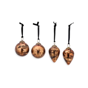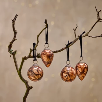 These Jalshara Baubles from Nkuku will give an understated elegance to your Christmas Tree and Festive decorations. They have a gentle decadent Antique Copper warm tone and display beautifully with the other colours in the range (Moss and Antique Smoke).