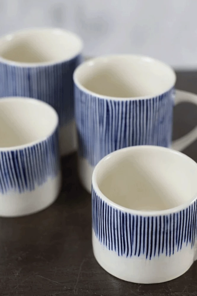 The distinctive Karuma Short Ceramic Mug by Nkuku features a design of thin blue lines. Each one has been individually etched and hand painted by traditional age-old methods in North Vietnam. This mug offers both eye-catching and tactile properties, that make it the perfect mug for drinking your morning coffee. Karuma Ceramic Short Mug Handmade in North Vietnam Etched with traditional wooden tools Hand painted Blue and white design 7 x 8cm (dia) Product code: 39282