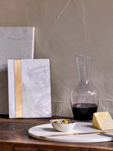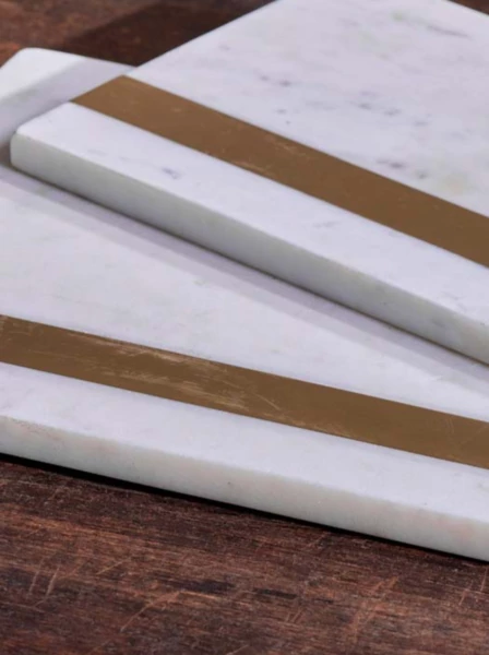 The rectangular shape of the Kasa marble board is enhanced with a wide thread of brass that runs through the marble board. The warm, golden hues of the brass compliment the off-white natural stone to create an elegant board, ideal for displaying and serving sharing foods. Material: Marble and Brass Care: Foodsafe. Handwash only, this item is not dishwasher safe.
