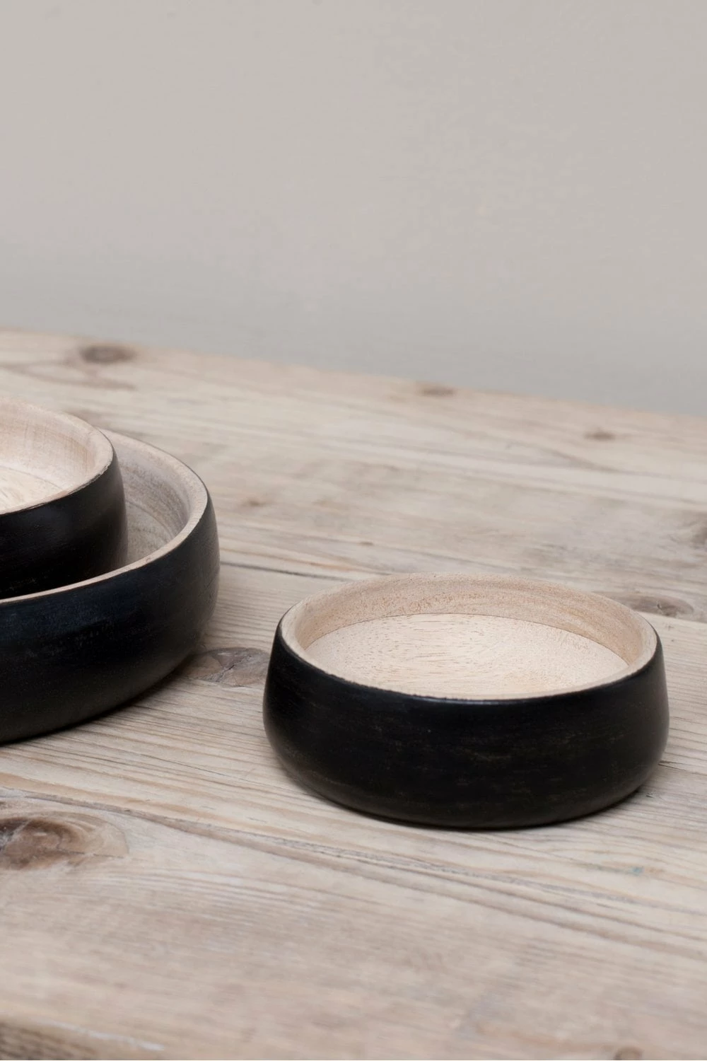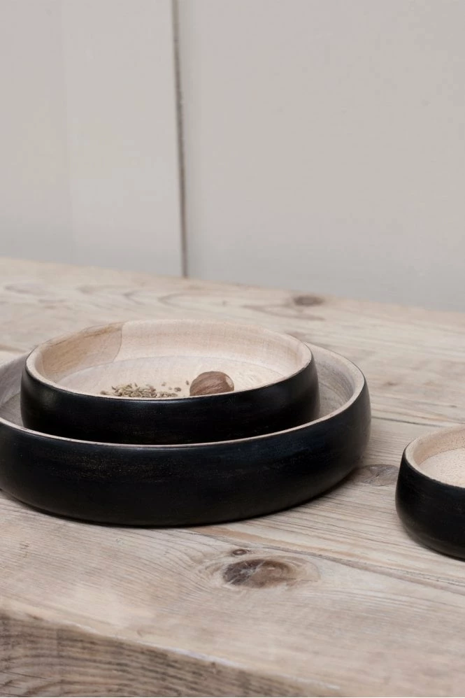 Do not leave to soak in water Do not pour boiling water onto product Small: H3.5x O9.5cm (approx.) Medium: H4.5x O15cm (approx.) Large: H4.5x O20cm (approx.) Simple yet striking, the Nkuku Kinuku Mango Wood Bowl comes in a variety of sizes and makes perfect fruit display bowls. Outside of the bowl is coated in a black paint, which contrasts beautifully against the mango wood inner to create an eye-catching collection. This stylish serve ware will look great at a bbq for your salads or just sat on your kitchen side. Mango wood Black Rustic charm Serveware Hand made 35197