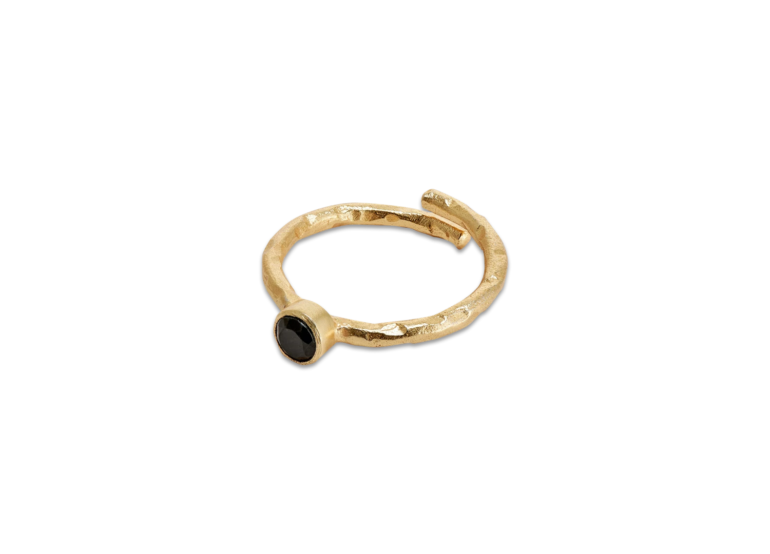 This beautiful Kira Ring from Nkuku has been handmade by artisans in India. All Nkuku jewellery is handmade for them by a fair trade enterprise. It is made from brass plated in 22 karate gold. This ring has a black onyx stone set within it and has a lovely hammered finish to the surface of the ring that creates a textured decoration. A simple but stylish design. The gold band is adjustable. 2cm diameter.