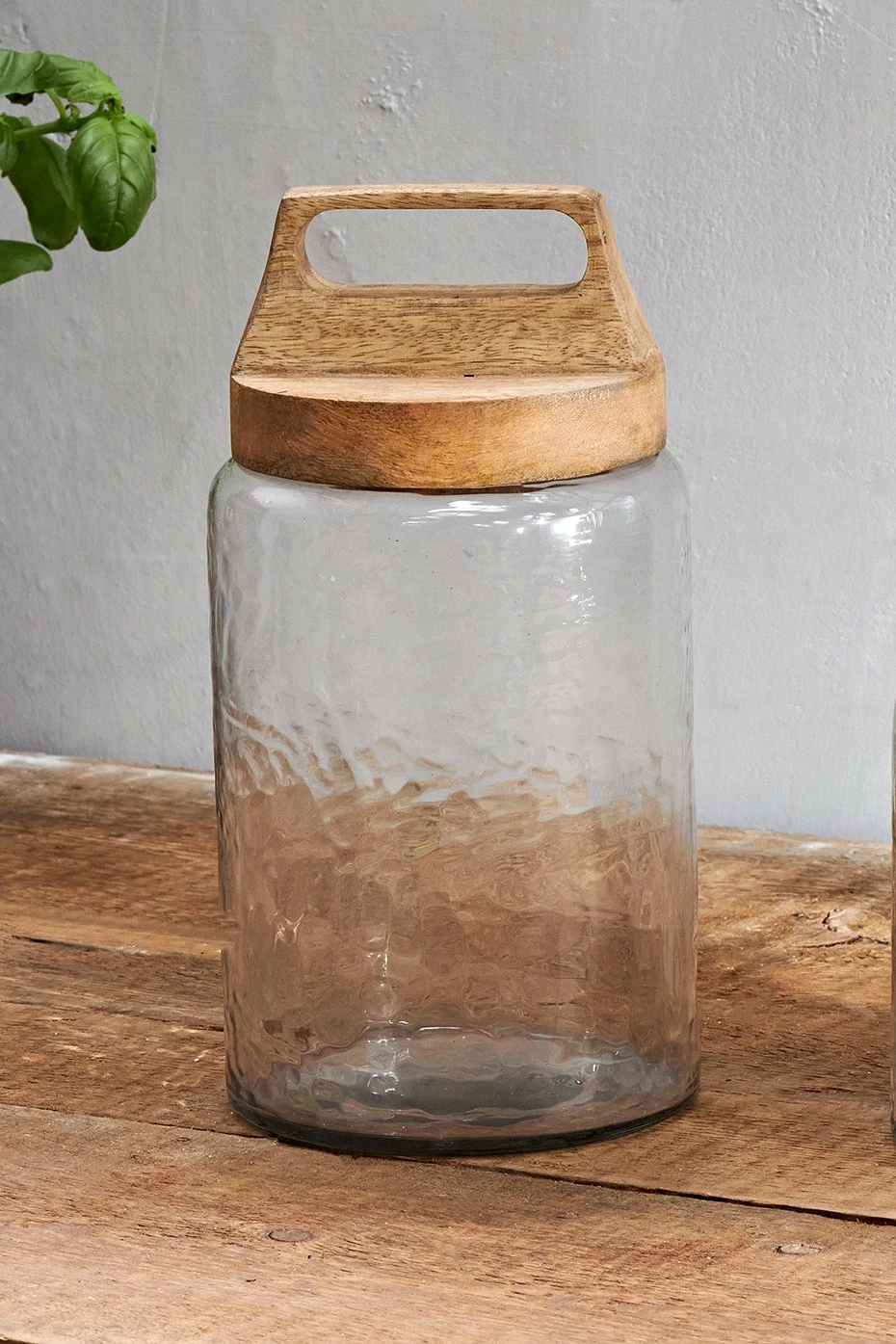 The Kitto range of storage jars are a great addition to the home, perfect for storing grains, cereals or other dry foods. Made from recycled glass and sustainable mango wood, the jar features an ergonomic handle for easy removal. The process of sourcing the recycled glass requires washing and melting the glass which is then hand blown and crafted using traditional tools which give the glass its hammered appearance. Available in two sizes.