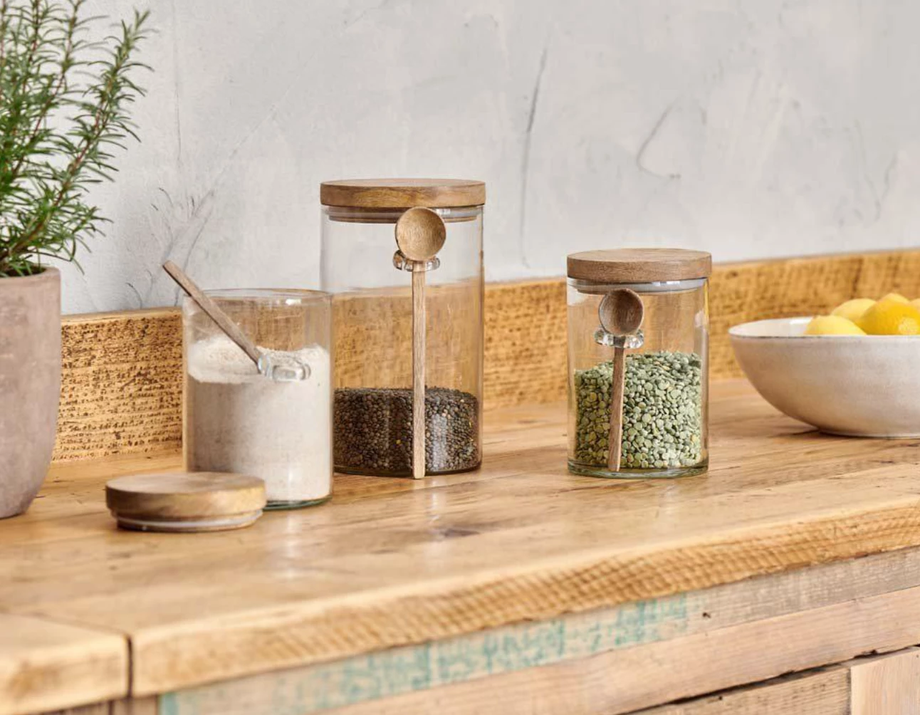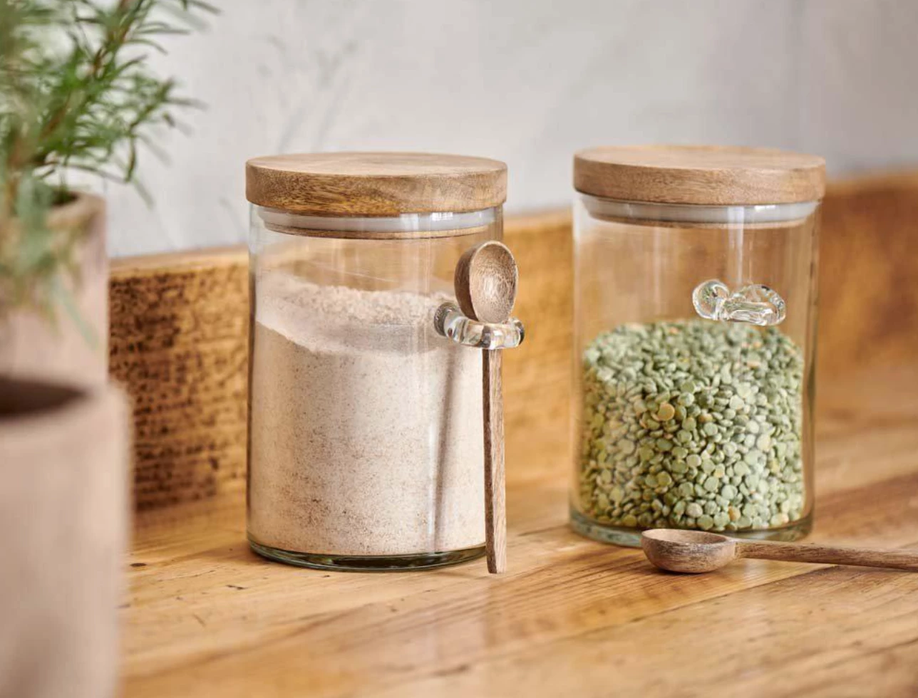 Style your pantry or kitchen shelves with these attractive Kossi storage jars. The recycled glass jar has a solid mango wood top and stylish glass loop for an accompanying wooden spoon.