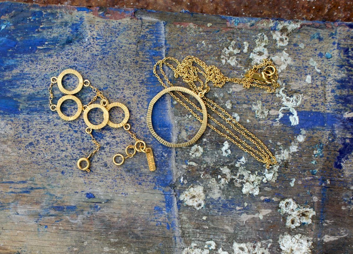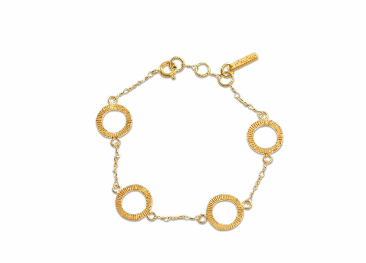 This beautiful Lalia Chain Bracelet from Nkuku has been handmade by artisans in Rajasthan. All Nkuku jewellery is handmade for them by a fair trade enterprise. It is made from brass plated in 22 karate gold. The lovely hoop shapes have been hammered to create a textured surface to the decoration. A simple but stylish design.