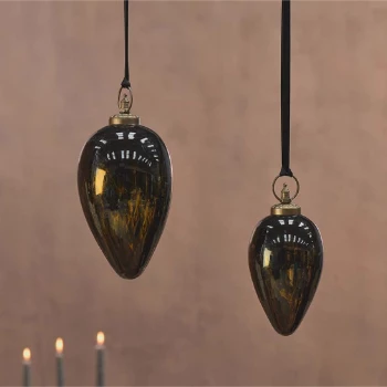 These giant glass, tear drop shaped Christmas decorations are finished in an atmospheric black and amber gold glaze.