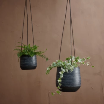 These lovely Mahika hanging baskets from Nkuku are perfect for displaying house plants. The black hand textured pattern on these metal planters makes them unique and contrasts beautifully with green foliage. Large opening width is 11cm. Available in two sizes.