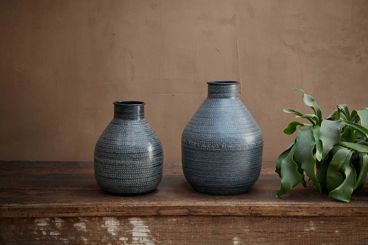 Strikingly imprinted using traditional tools, mahika vases have an eye-catching pattern and soft, organic shape. The matt black finish provides a contrasting backdrop for dried flowers and fresh blooms. Dimension: 33cm x 26cm x 26cm.