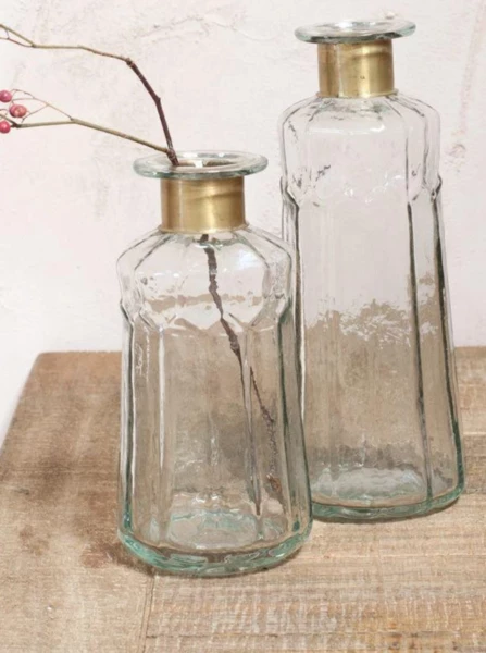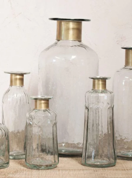 Our Chara bottles are full of sophisticated rustic charm; these artisan made pieces involve hammering the glass with traditional tools providing a subtle textured affect. The glass is skilfully blown through the brass ring creating this elegant shape. Solder marks are often evident on the brass as a result of this complex handmade process. Words of Wisdom Solder marks are often evident on the brass as a result of this complex handmade process. We use recycled glass to make these collections. Firstly, the waste glass is collected and washed to remove any impurities; it is then crushed and melted down before being hand blown or placed in moulds to create beautiful new products. H23cm x W9cm x D9cm