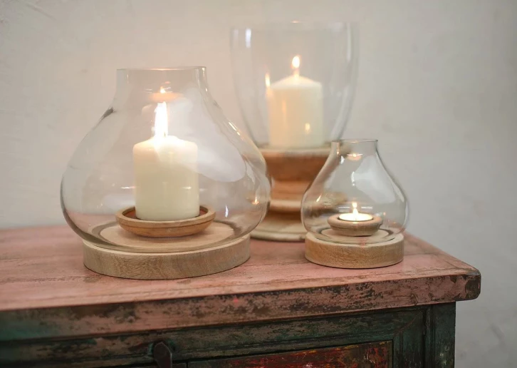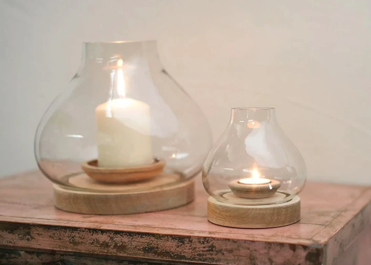 Perfect for atmospheric evenings, our stylish Naryla lanterns have a glass bulb shape that sits perfectly in a solid mango wood base. The elegant contrast of natural wood and recycled glass work beautifully together. The practical glass surround makes these suitable for outside use