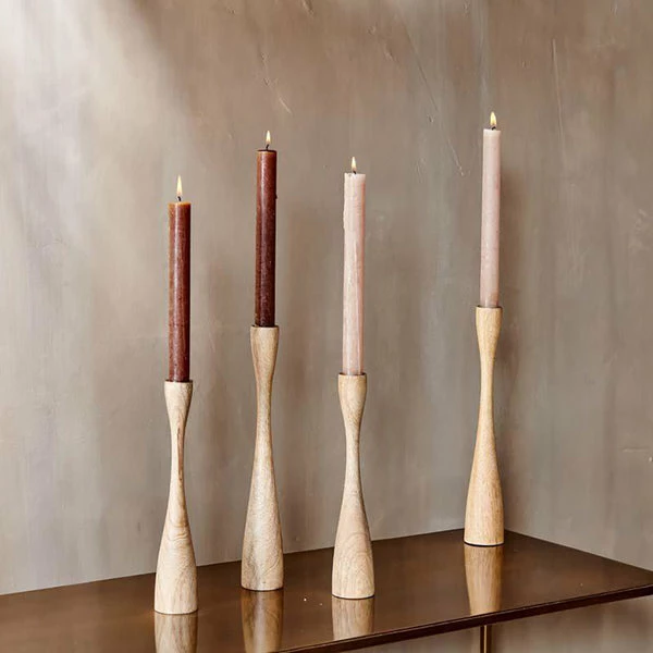 Hand crafted from sustainable mango wood, these beautiful candlesticks are ideal for adding a hint of understated, natural style to your interior. The smooth, flowing forms are carved by hand, and include a metal candle holder, to fit a standard 2cm diameter dinner candle. Large Natural Mango Wood Candlestick. Sold individually. Hand carved. Made from sustainable mango wood.* Dimensions approx. 30.5cm (H) x 5cm (Diameter). Fits standard dinner candle, 2cm (dia). *Made from sustainable mango wood. The Mango trees are initially grown for their fruit, harvested over a number of years. Once the trees have stopped bearing fruit, they can be cut down and used to make wooden pieces. This allows farmers to plant more trees and provides them with a supplementary income. Care Instructions: Please position candle securely. This product will get hot in use. Keep out of reach of children. Wait until fully cooled before handling. Never leave a burning candle unattended.