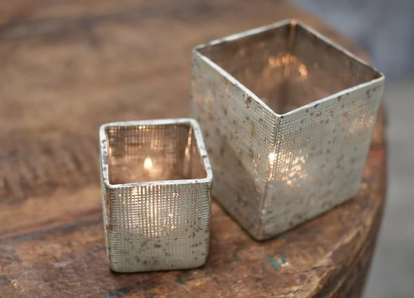 The Subira Etched T- light holders are handmade from recycled glass. Each one has a rustic silver finish, the glass has been hand etched in this eye catching design which enhances the candlelight within.