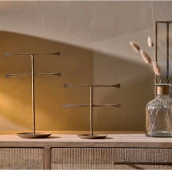 This simple but stylish Liman jewellery stand from Nkuku is perfect for a dressing table. It has two hanging sections ideal for necklaces and bracelets as well as a useful tray at the bottom for rings and studs. Made from brass it would make a nice decorative piece for the bedroom.