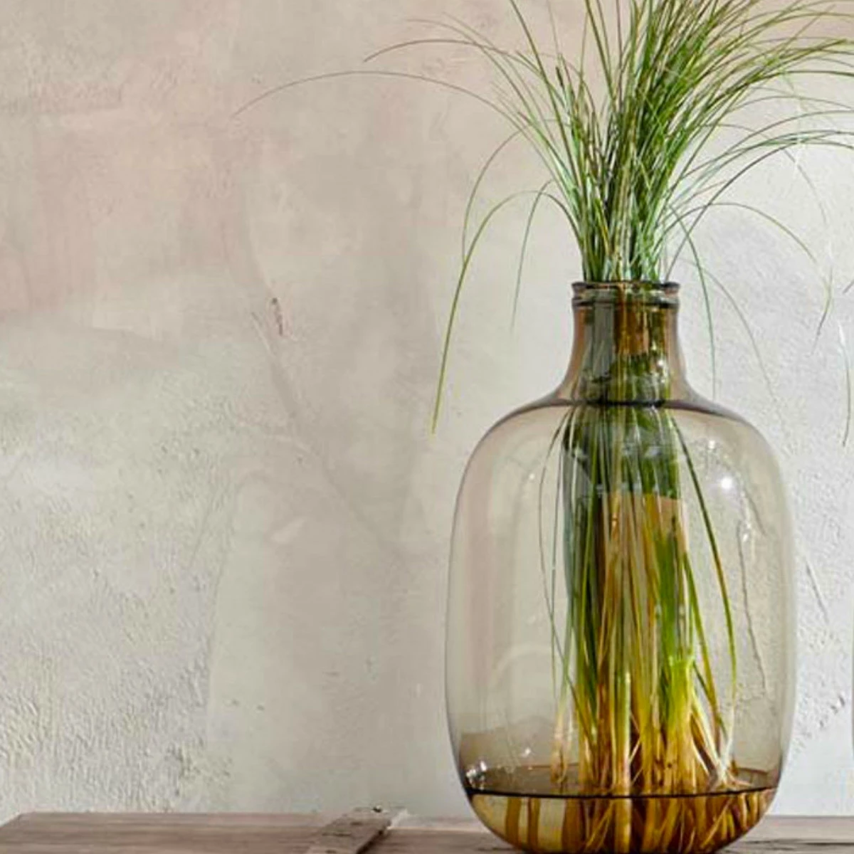 The organic shapes of our Lua glass vases are given even more appeal by their light earthy green tones. The traditional bottle shape is ideal for display.