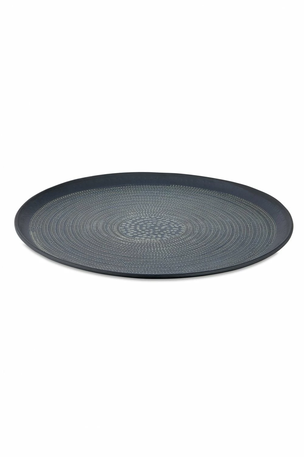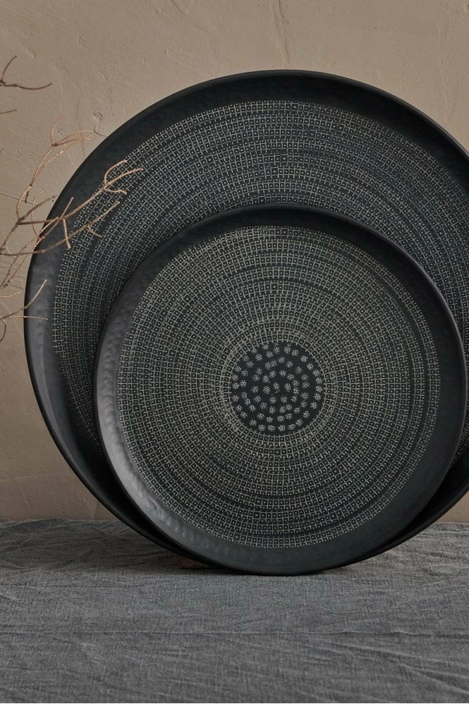 Small: 2cm x 40.5cm(dia) Large: 2cm x 54.5cm (dia) The Nkuku Mahika Tray is a striking display and practical piece that will look wonderful in your home. This tray has been handcrafted and hand etched using traditional methods, the black round tray has a intricate pattern engraved into it for an authentic feel. Use yours as a statement backdrop piece or as fruit bowl on your dining room table. Black Tray Aluminum Intricate pattern Hand etched 37577